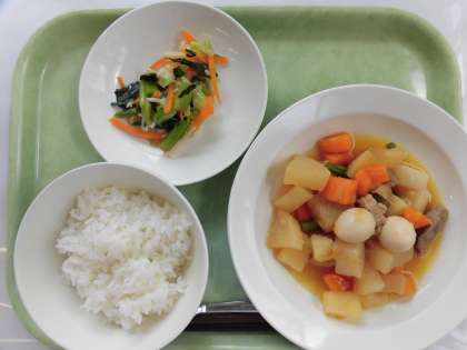 【献立】ごはん・豚肉と大根のうま煮・和風サラダ・牛乳