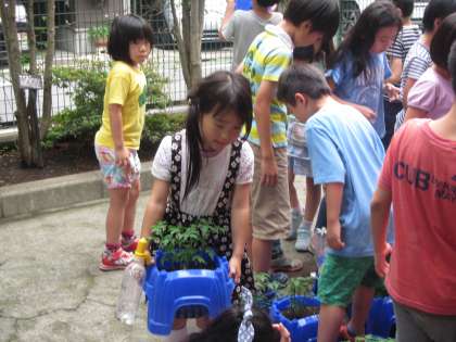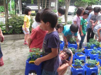 2年生が大切に育てているトマトの苗が順調に成長しています。