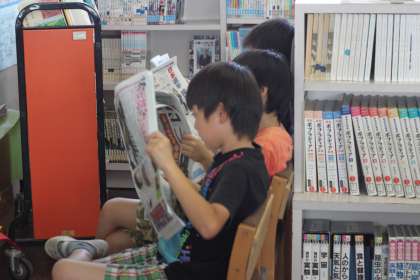 若小名物の小学生新聞コーナーも大人気で、通勤電車のような光景です。