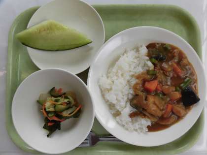 【献立】夏野菜のカレー・わかめサラダ・メロン・牛乳