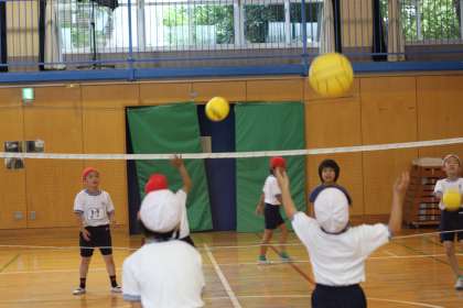 ネットを張ったコートをつかって、ボールを打ち合っています。