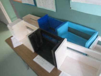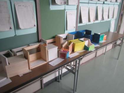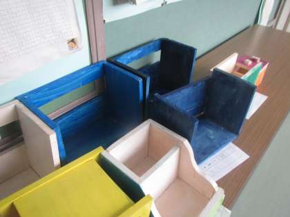 6年生が図工で取り組んだ木工作品が、教室前に展示されています。