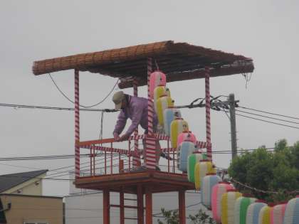 明日から始まる若林町会大盆踊り大会に向けて、校庭に櫓が組みあがりました。