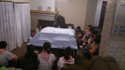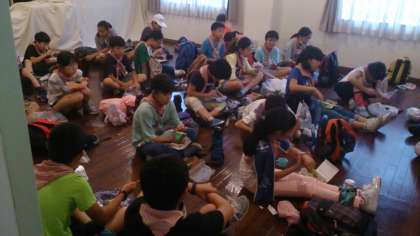 広場で食べる予定を変更し、宿舎で昼食を取っています。