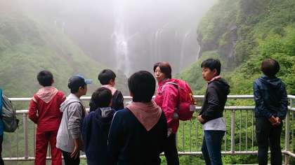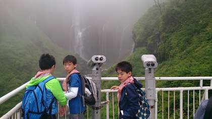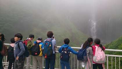 霧が深く、高い所から流れ落ちる迫力を味わうには難しい状態でしたが、クラス単位で記念撮影を行いました。
