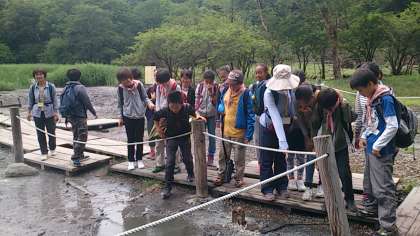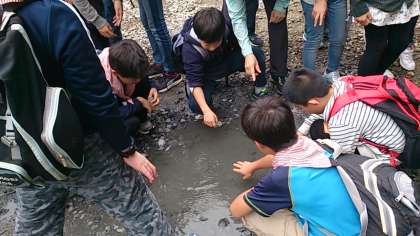 若小のみんなも、地面から温泉が涌き出るところに触れる体験をすることができました。