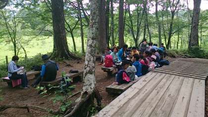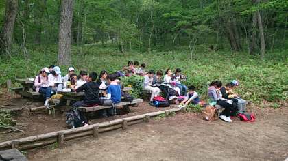 お昼の時間になりました。行動班に別れ、木道沿いのベンチでお弁当を食べています。周囲は大自然が広がっています。風がとても爽やかです。
