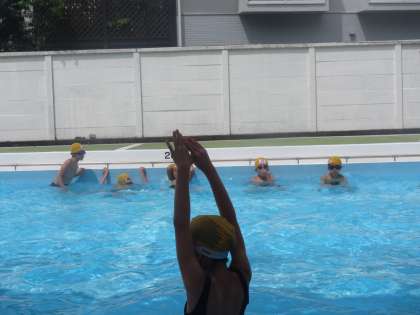 夏の空のもと、元気いっぱいに泳ぐ若小の子たち。