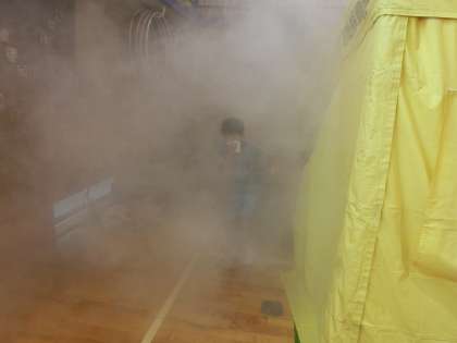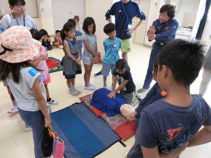 全体で消防隊員さんの訓練を見学した後は、班に分かれて、通報訓練、AED訓練、煙中体験などを行いました。