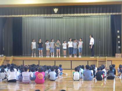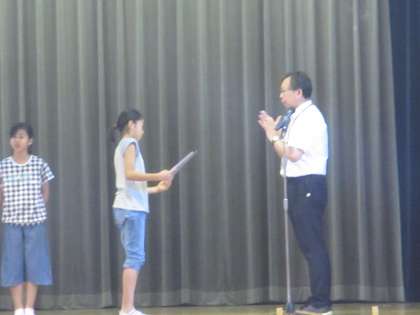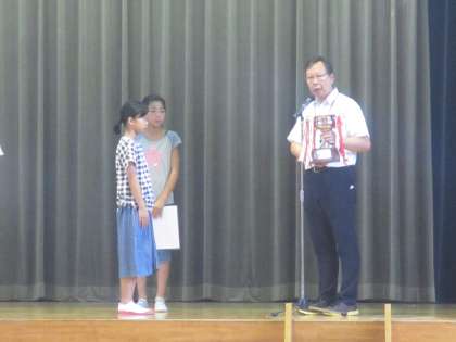今日の始業式の後で全校児童の前で表彰を受けました。