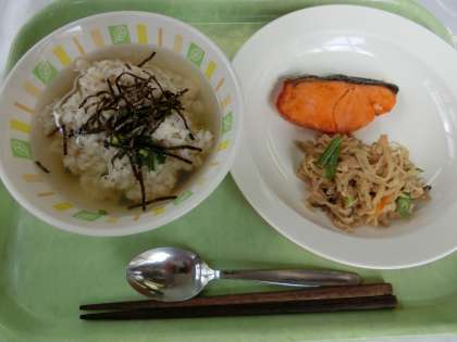 【献立】梅茶漬け・鮭の塩焼き・切り干し大根の煮つけ・牛乳