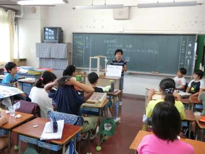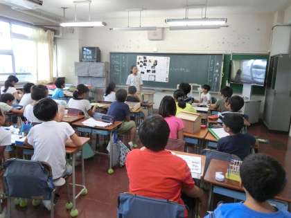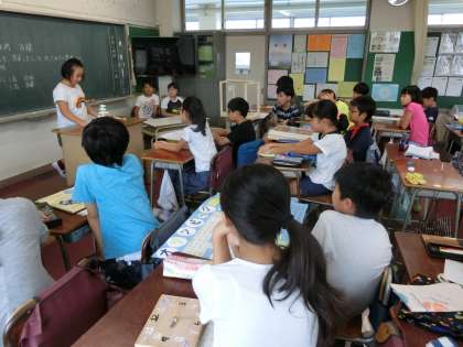 廊下に展示してある夏休みの自由研究。お互いの作品を発表する学級もあります。写真は5年生の様子です。研究するきっかけや、工夫したところ、苦労した点などを伝えあっています。みんな、仲間の作品に興味津々でした。