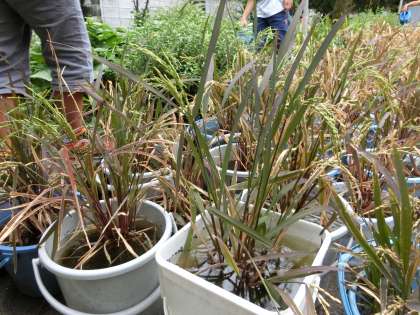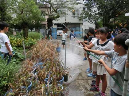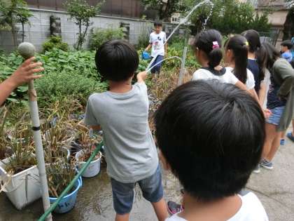 1学期に植えた通称「バケツ稲」が育ってきました。おいしいお米ができるよう、バケツに水を補充していきました。