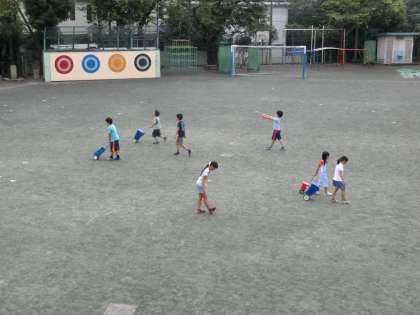 校庭では、用具係が実際の運動用具を持って活動しました。
