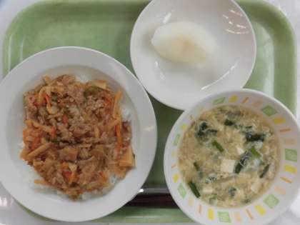 【献立】スタミナ丼・にらたまスープ・梨・牛乳