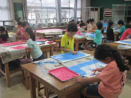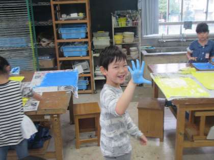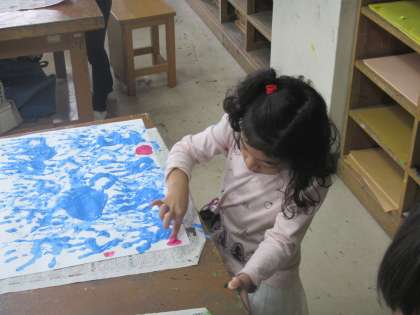お盆の上につくった色を手につけて、自由に形で描きます。
