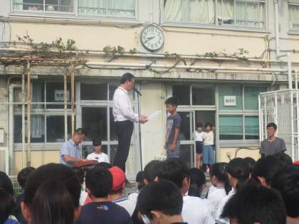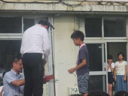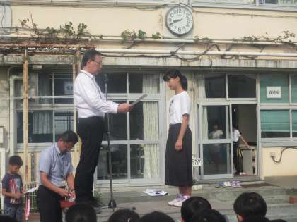 児童朝会の最後に、区民スポーツ大会の空手部門で優秀な成績をおさめた子の表彰がありました。