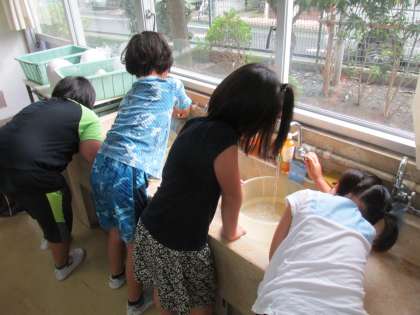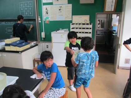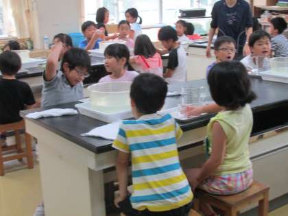 2年生が算数の時間に理科室で水のかさを計る活動をしました。
