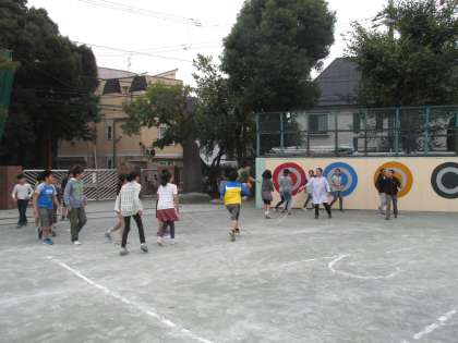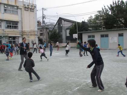 今朝の運動朝会で、若小チャレンジ長なわとびのための練習がありました。