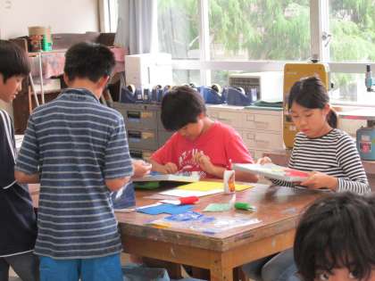 5年生は図工の時間に、色々な紙を組み合わせて作るおもちゃ「ビー玉ころころ」を作りました。