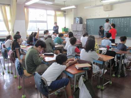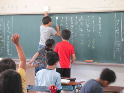 5年生が学級活動の時間を使って創立145年記念音楽会のスローガンについて相談しています。