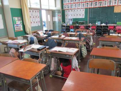 日頃の訓練の経験をいかして、みんなすぐに机の下に隠れます。
