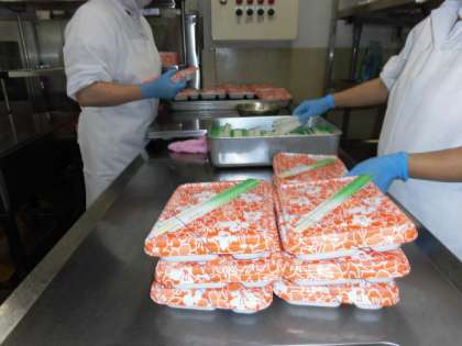 若小班交流給食では、給食室で作ったお弁当を食べました。お弁当を作っている様子をご紹介します。