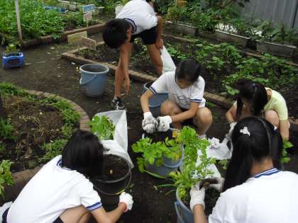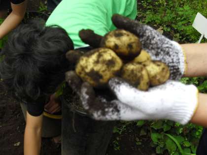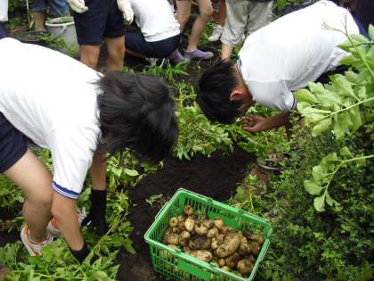 5年生の時に植えたジャガイモを収穫しました。学級園のジャガイモはとても大きく、たくさん収穫できました。7月2日(金)の給食でミネストローネに使います。3ヶ月間一生懸命育ててきたジャガイモに、子供たちも目をかがやかせていました。