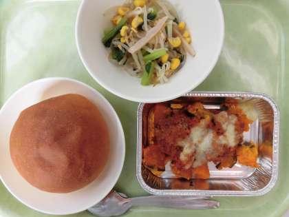 【献立】ミルクパン・かぼちゃのチーズ焼き・青菜のサラダ・牛乳