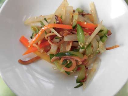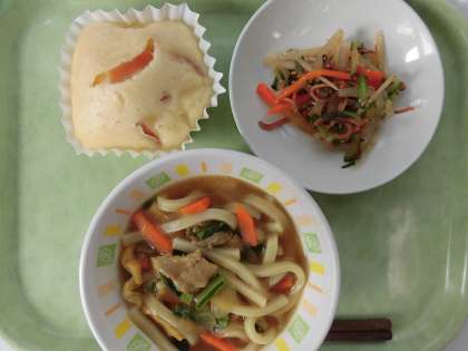 「かみかみサラダ」命名の由来は、するめとごぼうが入っているからです。するめは、水で戻してから、15分ほど蒸してサラダにいれました。よく噛まないと、するめのおいしさがわからず、噛めば噛むほどおいしく感じられるサラダでした。区のホームページでレシピを紹介しています。「せたがや食育メニュー」をご覧ください。