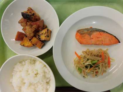 【献立】ごはん・魚の西京焼き・もやしの浸し・りんご入り大学芋・牛乳