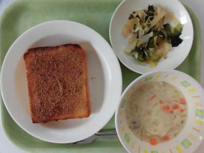 【献立】セサミトースト・じゃこ入りサラダ・チャウダー・牛乳