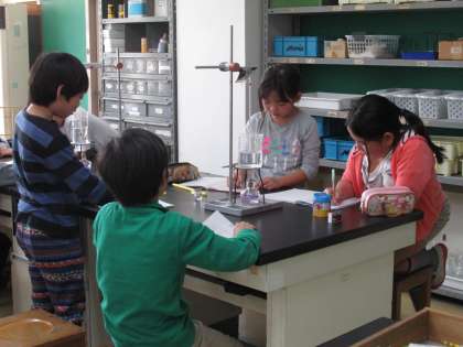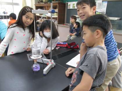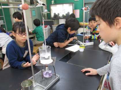 今日は水をビーカーに入れ、アルコールランプで温める実験をしました。