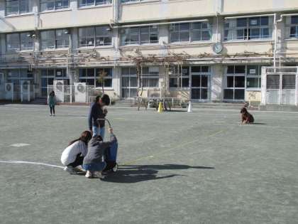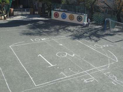 なかなか身の回りにあるものではイメージしづらい単位ですが、校庭に1アールの正方形をかいてみました。