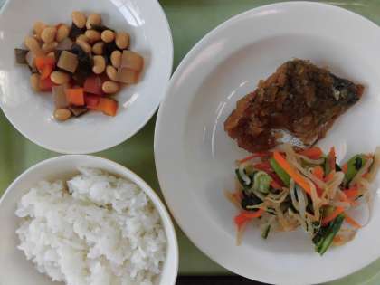 【献立】ごはん・さばの黒酢煮・おひたし・五目豆・牛乳