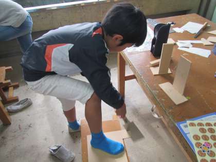 のこぎりを手に、欲しい形に板を切り取る子どもたち。
