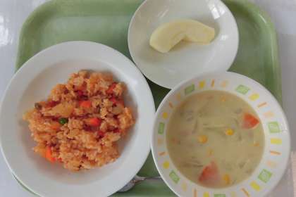 【献立】チキンライス・クリームスープ・りんご・牛乳