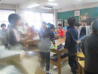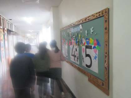 5年生が図工の時間に、校舎内にある「かおの形」を探しに行きました。