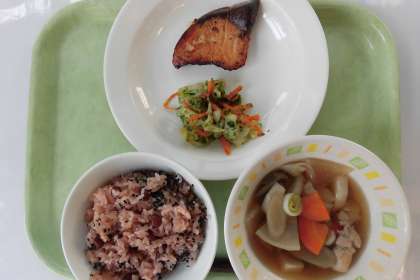 【献立】赤飯・ぶりのゆうあん漬け・白菜のひたし・世田谷根菜汁