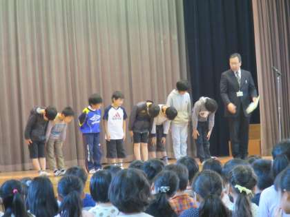 校長先生から賞状をうけとり、全校から拍手を受けます。