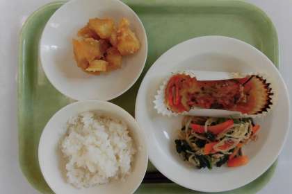 【献立】ごはん・魚のみそチーズ焼き・おひたし・じゃがいもの甘辛煮・牛乳