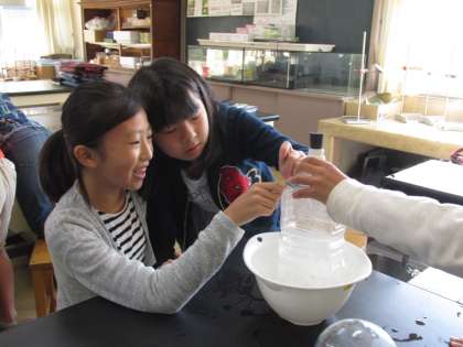 理科室では、熱いお湯にペットボトルを漬けて、キャップの外れる様子を観察しました。