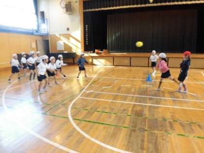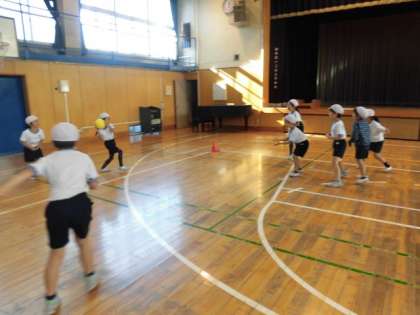 体育で、ボールを転がしたり投げたりして、ボール遊びをしています。