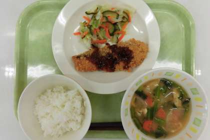 【献立】ごはん・魚のフライ・野菜の甘酢かけ・みそ汁・牛乳
