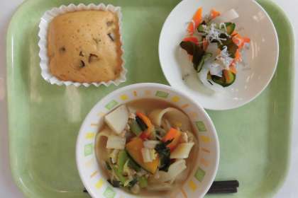 【献立】ほうとう・わかめとしらすの酢の物・きなこ蒸しパン・牛乳