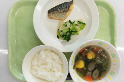 【献立】ごはん・さばの塩焼き・かぶのゆず醤油かけ・南瓜のだんご汁・牛乳