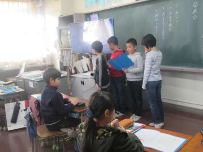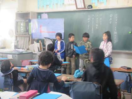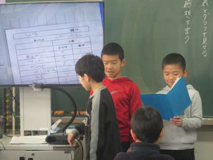 3年生が国語の時間に学習した調査結果を発表しています。