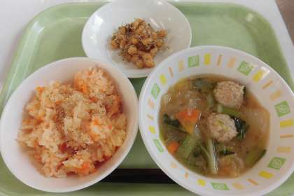 【献立】あけぼのごはん・肉団子入りみそ汁・大豆とじゃこの甘辛揚げ・牛乳