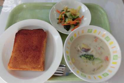【献立】シナモントースト・さつまいもシチュー・わかめサラダ・牛乳