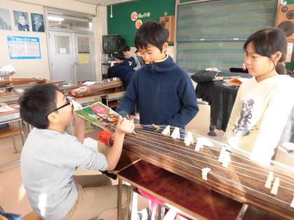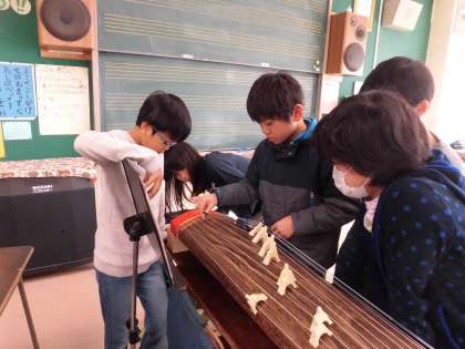 5年生は音楽の時間に、日本の伝統楽器である「お琴」に触れ、演奏してみました。
